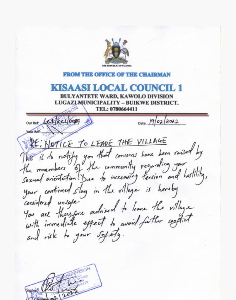 The notice, dated February 19, 2022, issued by Kisaasi Local Council 1, cited growing concerns among residents regarding his sexual orientation, which reportedly led to tension within the community.